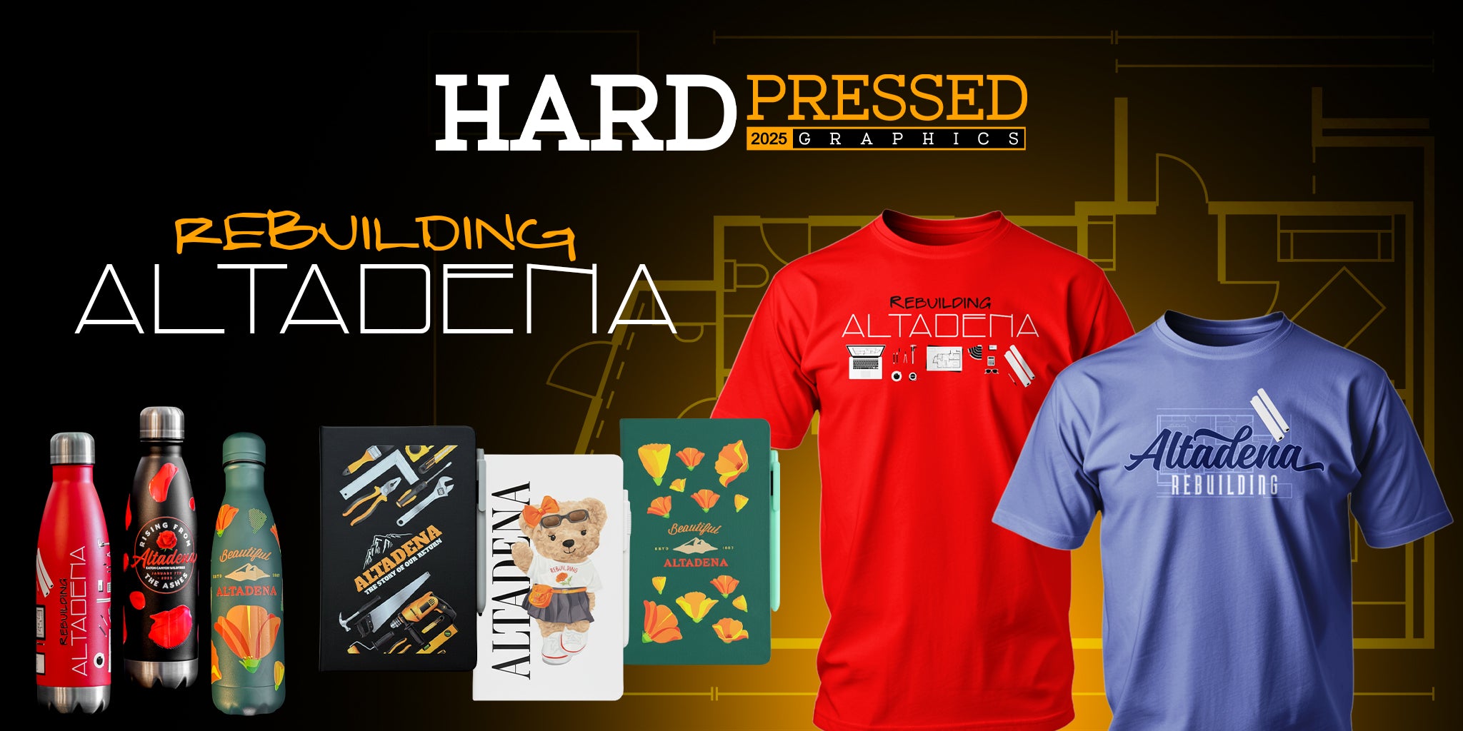 We are a couple from Altadena and Los Angeles. We came together and after our businesses were left desolate and our clientele lost in the Altadena, Eaton Canyon WildFires. We have joined together to encourage our neighbors and show our community Love with Hard Pressed Graphics, an Apparel Brand, that represents the people of the Dena. While our previous businesses were also lost in the Wildfires. In this new venture we are Passionate and Hopeful for what's to come as we all rebuild our homes, lives, and our communites! Altadena Stronger Together! Enjoy your apparel and thank you for patronizing us!